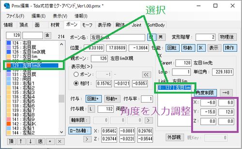 目ボーンの角度に制限をかけるリグを追加するPMXEditor用のプラグインです。 IKボーンを選択してLinkの中のボーンを選択して出てくる角度制限を調整します。 デフォルトでは画像の通りの数値が入ってますがモデルによって最適値は違います。 ここで設定したX…