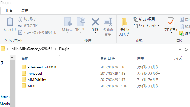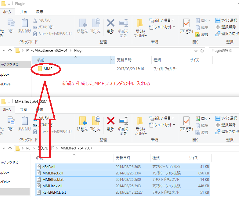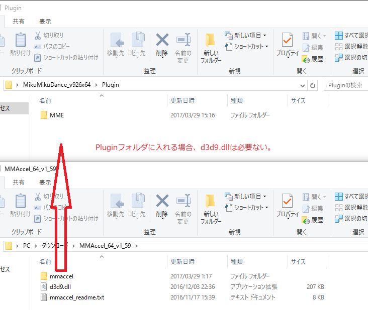 「d3d9.dll」以外のMMEファイルを「MikuMikuDance.exe」と同じ階層に入れます。